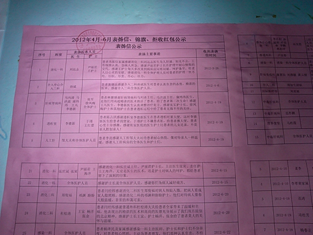 2012年上半年,在院党委的正确领导下,在医院各兄弟科室的密切配合和共同努力下,我院医德医风建设工作取得了较好成绩:1至6月份全院共收到表扬信50余封;收到锦旗48面,较去年同期增长17%;医务人员拒收红包59000元,较去年同期增长28%。