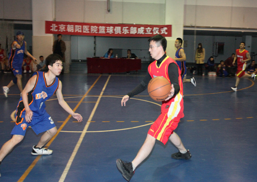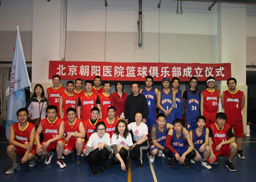 3月23日,北京佑安医院篮球队受邀参加朝阳篮球俱乐部成立仪式在广安体育中心举行,近40余名队员参加了此次成立仪式。仪式由北京朝阳医院工会施云梅副主席主持,党委书记、理事长封国生来到活动现场,首先对篮球俱乐部成立表示祝贺,之后封理事长向篮球队队员授旗、授队服。随后朝阳篮球队与佑安医院篮球队进行了一场友谊赛,经过四节紧张激烈的比赛,最终以27:35憾负对手。在篮球友谊赛过程中,双方队员表现出了友谊第一,比赛第二的体育竞技精神。