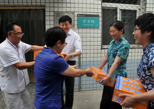 71日下午,李宁院长、李玉梅书记、向海平副书记和孙桂珍、金荣华副院长带领党办、工会、人事处、护理部等职能科室的负责人一同来到营养膳食科、锅炉房、供应室、煎药室、急诊科等高温作业的科室慰问医护人员,为他们送上清凉饮料,并带去了全院职工的亲切问候,叮嘱大家在完成好本职工作的同时也要保重自己的身体。