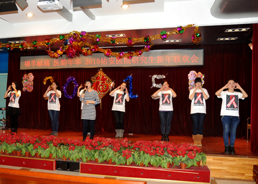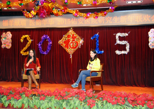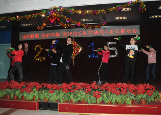 “福羊献瑞 医韵年华” 2015年首都医科大学附属北京佑安医院新年联欢会于新春前夕在佑安医院报告厅隆重举行。院长李宁,教育处孙主任及各位老师出席了本次联欢会。在教育处的大力支持下,全体研究生共同出谋划策,自编自排了许多精彩节目。