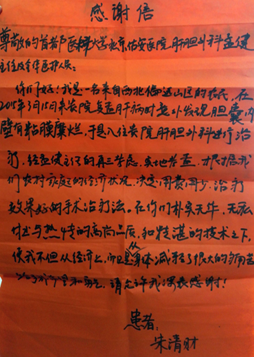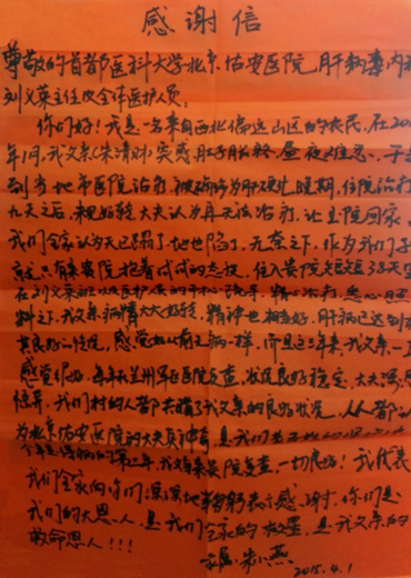 2015年4月8日上午,北京佑安医院纪检办收到两封色彩鲜艳的感谢信,这是一对父女用黑色水笔写在两张大彩纸上,表达对中毒肝病科刘义荣主任和肝胆外科孟健医生感激之情的信。这一对父女来自西北偏远山区,父亲三年前患有肝硬化,经当地医院治疗无效,抱着试试看的态度来到我院。中毒性肝病科刘义荣主任在短短三十八天里,经过精心治疗,使患者恢复得很好。患者非常感谢刘义荣主任及全体医护人员,尤其是他们精湛的医术,高尚的医德。3月15日,他们来医院复查,发现患者胆囊内壁有粘膜糜烂。肝胆外科孟健医生全心全意为患者考虑,开展费用少,效果好的手术治疗,为患者减少经济负担,减轻身体痛苦。目前患者恢复良好,父亲送来感谢信,感谢两位大夫以及全体医护人员。女儿也附上感谢信,由衷地感谢医生的治疗,还给他一位健康的父亲。