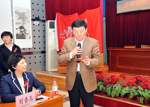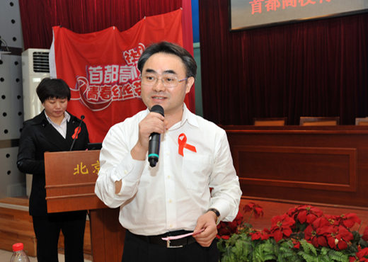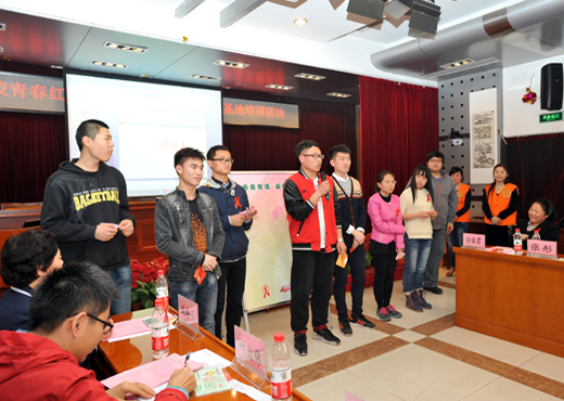 首先由李宁院长向大家致欢迎辞。2009年北京市卫生局授予“北京佑安爱心家园”作为“首都高校青春红丝带社团”的社会实践基地。6年来,基地为学生们创造了学习了解艾滋病知识的平台,招募了千余名学生志愿者的加入。随后,首都高校青春红丝带社团副主任许建农就上一年度工作做工作报告,强调了在大学生群体中开展防艾工作的重要性。爱心家园福燕护士长就2014年大学生社会实践基地的工作情况做总结发言。活动中设置了互动环节,领导及嘉宾在鼓励卡上写下对学生们的寄语,并亲手贴于活动背板的留言处。学生们以同样的方式将卡片贴在活动背板上。通过分享自己在防艾工作中的经验和感受,让更多的学生志愿者参与进来。最后,北京市卫计委疾控处谢辉处长对此次培训活动给予高度评价,肯定了学生们在防艾志愿工作中发挥的作用。