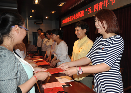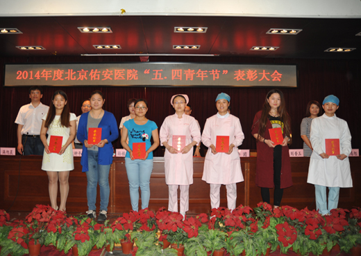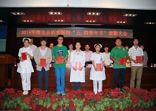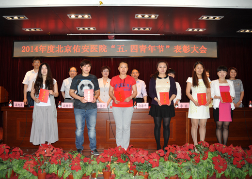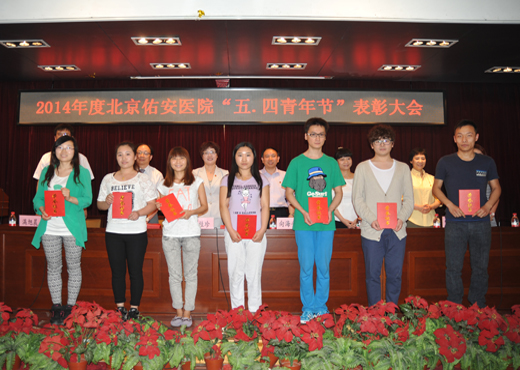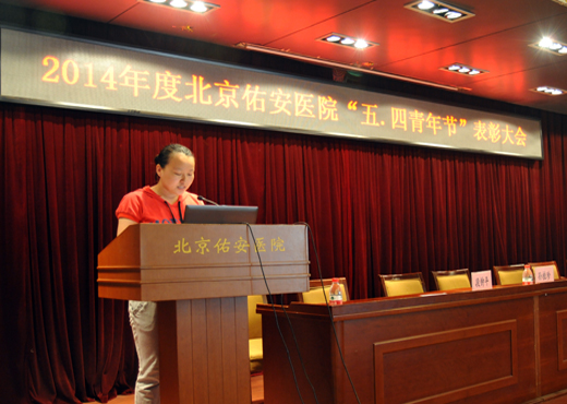 大会,首先由团委书记张鸣旭做2014年度团委工作总结。随后,副院长孙桂珍宣读《北京佑安医院关于表彰2014年度五四红旗团支部、优秀团干部、优秀共青团员的决定》。在宣读表彰通报后,医院领导为荣获五四红旗团支部、优秀团干部、优秀共青团员颁发荣誉证书。随后,优秀团支部代表、优秀团干部代表、北京市青年岗位能手黄晶上台发言。