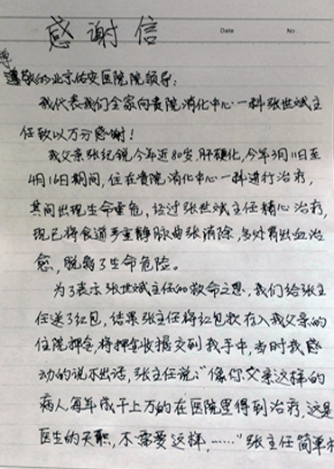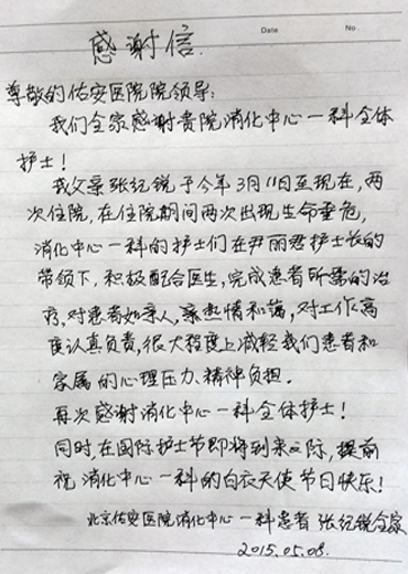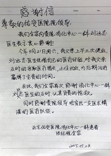 北京佑安医院纪检办公室收到来自肝病消化中心患者的感谢信