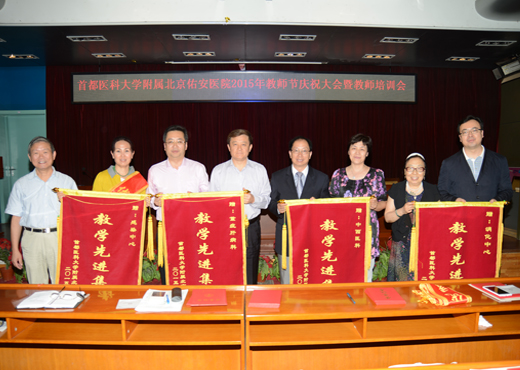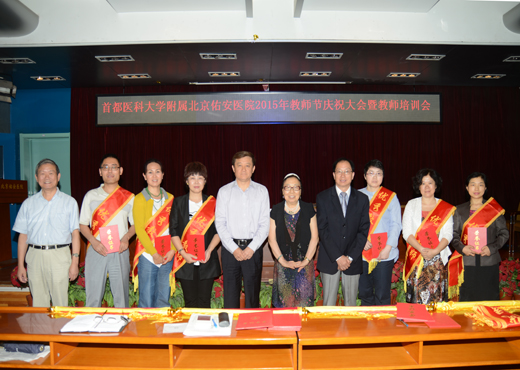 段钟平副院长向辛勤耕耘和无私奉献的全院教师致以亲切的慰问,并宣读了2015年教学工作先进集体和优秀个人表彰决定,娄金丽荣获首都医科大学优秀导师称号;李在村、李雪梅荣获首都医科大学优秀教师称号;佑安医院教学先进集体是:感染中心、重症肝病科、消化中心、中西医结合中心;陈德喜、丁惠国荣获佑安医院教学优秀导师称号;于红卫、刘建京、刘华仙、朱跃科、梁连春、段钟平、郭彩萍、郑素军、王贞彪荣获优秀理论授课教师称号;李丽、张宏伟、张月宁、韩莹、柳雅丽、韩大康、惠威、刘义荣、黄晓婕、黄云丽荣获优秀见习带教教师称号。教学督导专家、院领导为优秀教师代表颁发荣誉证书 。与会同时,优秀教师代表和大家分享了教学工作经验。李宁院长代表全院干部职工向辛勤耕耘和无私奉献的一线教师致以亲切的慰问和美好的祝愿,向关心、支持医院建设与发展的老专家、老教授们致以衷心的感谢和崇高的敬意,并对今后的教学工作给予厚望。