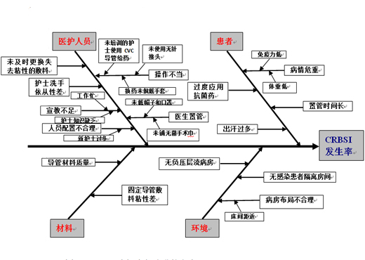 经过上述调查,CQI小组认为CRBSI发生与置管时反复穿刺、护士缺少专业培训、风险意识重视程度不够、缺乏关键防控措施和感染控制管理不力有关。还发现预防和控制CRBSI的标准规程和技术指南内容陈旧,未细化实施步骤,缺乏实际指导意义。另外,ICU患者病情危重、伴有严重的基础疾病,中心导管、有创治疗和抗生素使用密集,抵抗力差,是普通病房患者的3~5倍。影响CRBSI的具体因素分析见如下鱼骨图。