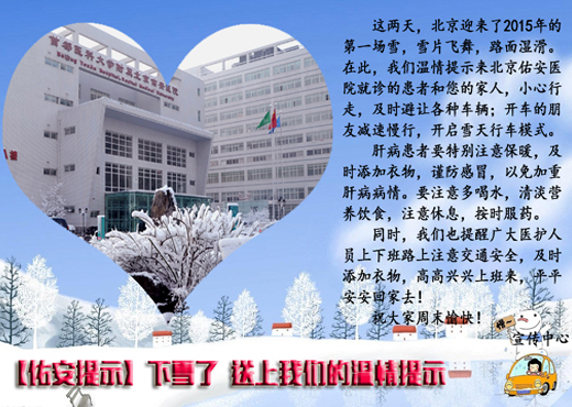 这两天,北京迎来了2015年的第一场雪,雪片飞舞,路面湿滑。在此,我们温情提示来北京佑安医院就诊的患者和您的家人,小心行走,及时避让各种车辆;开车的朋友减速慢行,开启雪天行车模式。