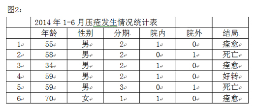 我科室2014年1月至6月,共上报压疮6例,其中2例为院外带来,4例为院内发生。4例院内发生压疮,1例为Ⅰ期压疮,3例为ⅡⅢ期压疮。其中Ⅰ期压疮经对症护理,很快痊愈,1例Ⅱ期压疮经积极护理,出院时基本痊愈,但花费较高。另外2例患者因病情危重死亡,由于皮肤破损,增加了患者痛苦和费用,加大了护理工作量。