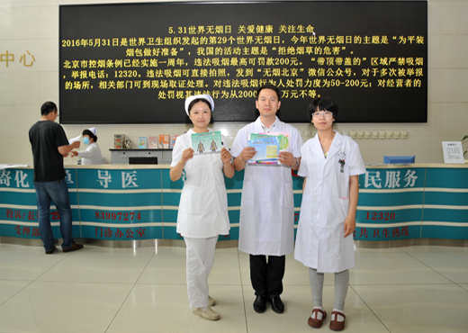 今年5月31日是世界卫生组织发起的第二十九个世界无烟日,又恰逢《北京市控制吸烟条例》(以下简称条例)颁布实施一周年,为了加强控烟宣传和健康教育工作力度,维护公众健康,我院开展一系列无烟日宣传活动,通过利用电子显示屏、制作宣传海报、控烟易拉宝、发放控烟宣传卡片等形式向广大患者家属及医务人员宣传世界无烟日。今年世界无烟日的主题是“为平装烟包做好准备”,我国的活动主题是“拒绝烟草的危害”。
