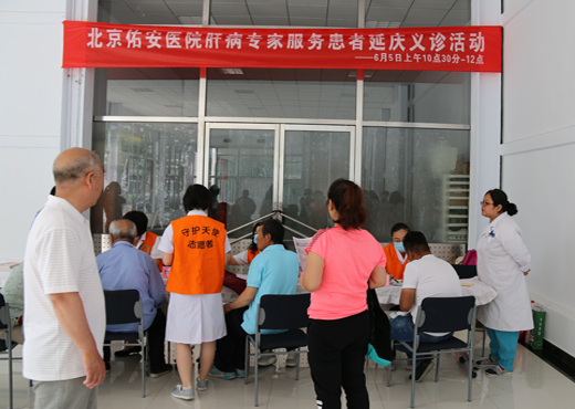 第二组是肝病义诊活动。为满足患者需求,支部特派出4位医生参加义诊活动。延庆医院门诊大厅内,在醒目的“北京佑安医院肝病专家服务患者延庆义诊”横幅下,4位医生一字排开,热情服务于早已等在那里的患者。延庆医院还特意派来三位护士帮助维持秩序。义诊过程中,医生们将我院的各类宣传册及疾病知识书稿和折页派发给患者,受到患者欢迎和好评。
