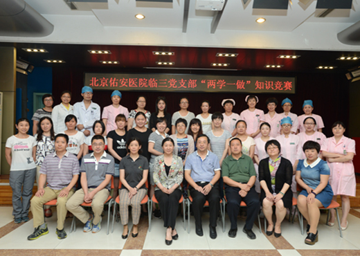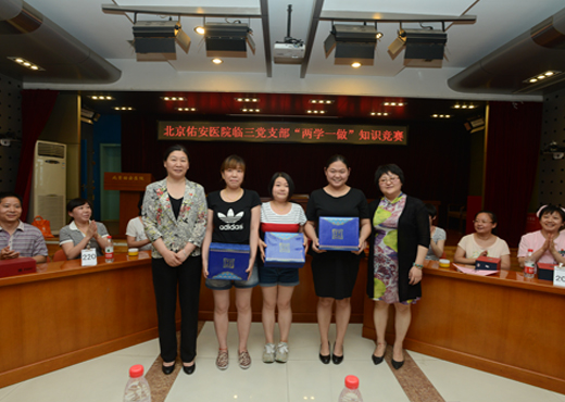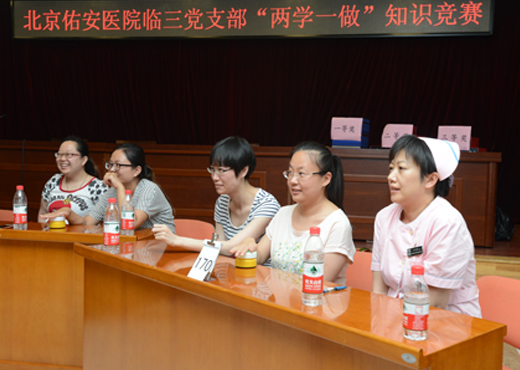 北京佑安医院党委积极开展“两学一做”学习教育,引导党员,坚定理想信念,对党绝对忠诚。 为丰富学习教育形式,拓宽学习教育渠道,检验学习效果,6月16日下午北京佑安医院临三党支部举办了“两学一做”知识竞赛。党委李玉梅书记、党办张天舸主任、妇产科孟君主任、临三分会工会主席于红卫主任出席了本次活动。临三党支部书记朱云霞主任致开幕词,竞赛题目内容涵盖了《中国共产党章程》《中国共产党纪律处分条例》《中国共产党廉洁自律准则》等相关知识。分个人必答题、抢答题、风险题三个部分。