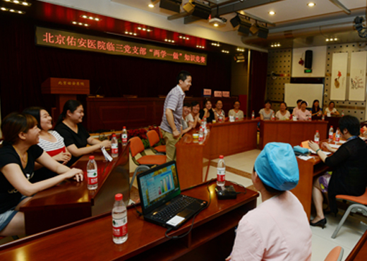 北京佑安医院党委积极开展“两学一做”学习教育,引导党员,坚定理想信念,对党绝对忠诚。 为丰富学习教育形式,拓宽学习教育渠道,检验学习效果,6月16日下午北京佑安医院临三党支部举办了“两学一做”知识竞赛。党委李玉梅书记、党办张天舸主任、妇产科孟君主任、临三分会工会主席于红卫主任出席了本次活动。临三党支部书记朱云霞主任致开幕词,竞赛题目内容涵盖了《中国共产党章程》《中国共产党纪律处分条例》《中国共产党廉洁自律准则》等相关知识。分个人必答题、抢答题、风险题三个部分。