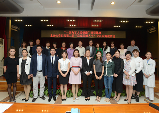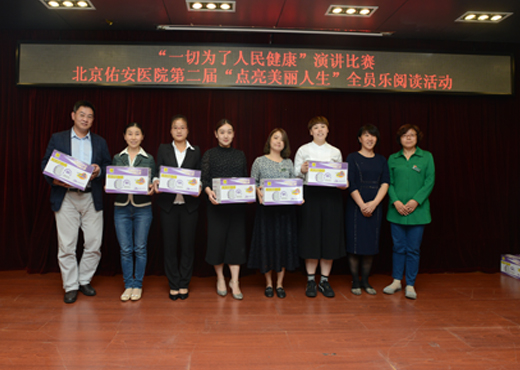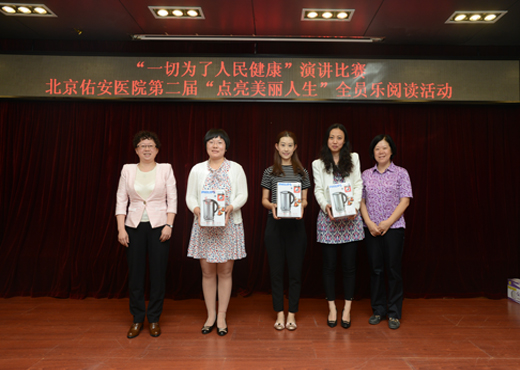 为大力培育和践行社会主义核心价值观,推动“学党章党规、学系列讲话,做合格党员”学习教育活动深入开展,不断提高医院广大党员、干部、职工的思想道德素质和医学人文精神, 9月27日下午,北京佑安医院在报告厅开展“一切为了人民健康”演讲比赛暨第二届“点亮美丽人生”全员乐阅读活动,12个支部推荐12名选手参加了比赛,评委组专家由向海平副书记、党办副主任张晓静、团委书记张鸣旭、统战人士代表放射科李宏军主任和13个党支部的支委组成,比赛由慢病管理中心的刘梦佳主持。