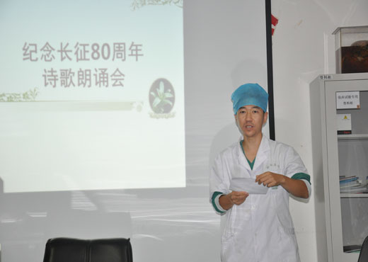 在纪念长征80周年之际,临床第五党支部在党员李文磊的主持下,进行了声情并茂的诗歌朗诵。外科中心的团员贵瑶瑶朗诵了“过雪山草地”, “四渡赤水出奇兵”党员王博朗诵了“红军不怕远征难”。党员权哲峰朗诵的“山”,带给我们不一样对山的理解。外科中心王怡老师,将自己对“长征”的理解进行了深度的剖析。李文磊、谷艳梅朗诵了 “长征之魂”。诗歌会结束后,大家纷纷表示,传承伟大精神,在新世纪的长征路上,一路高歌,再创辉煌。