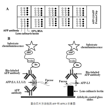 北京佑安医院研究团队对蛋白芯片检测方法和传统酶联检测方法进行对比,当AFP的cut-off值设定为20ng/ml,蛋白芯片方法诊断肝癌的敏感性为89.74%,特异性为100%;ELISA方法诊断肝癌的敏感性为87.17%和100%的特异性。当AFP-L3%-cut off值设定为0.1,蛋白芯片方法诊断肝癌的敏感性为56.41%,特异性为100%;ELISA方法的敏感性为53.84%,特异性为100%。AFP蛋白芯片和ELISA特异性和敏感性没有统计学差异。