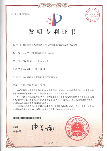 近日,北京佑安医院,北京市肝病研究所科研团队研究的“应用蛋白芯片进行肝癌标志物的血清学检测”创新成果发表在《Nature》 旗下的子刊《Scientificreports》 ,该文章的第一作者为北京佑安医院、北京市肝病研究所副研究员张爱英,通讯作者为北京佑安医院院长,北京市肝病研究所所长李宁。该成果已经获得了中国专利和两项澳大利亚专利.该创新成果还申请了美国专利,日本专利,加拿大专利,目前正在审批中。