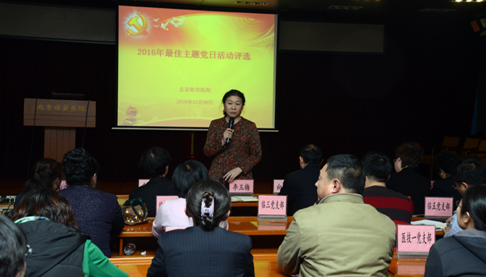 12月8日下午,院党委召开了“北京佑安医院2016年最佳主题党日活动评选会”。党委李玉梅书记、向海平副书记、副院长孙桂珍、工会刘香玉主席、党委委员任珍、统战人士代表马列清主任及各党支部书记出席评选会并担任评委打分。另外,各党支部委员、党小组长及支部骨干也参加了此次活动。会议由党办副主任张晓静主持。