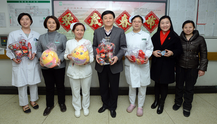 晚上李宁院长、李玉梅书记带领医院领导班子成员及相关职能科室负责人一起来到医院,代表全院职工向节日坚守在工作岗位上的医务人员进行慰问,并为坚守在一线的工作人员带去真挚的祝福,感谢他们为医院、患者欢度平安祥和的节日所付出的辛劳,并为值班人员送去慰问品和鸡年吉祥物。