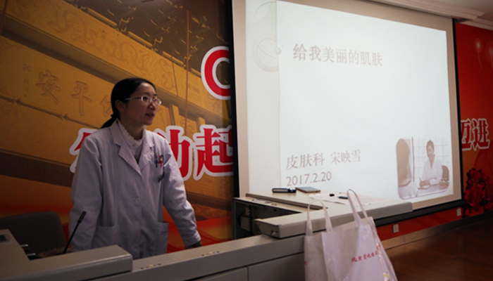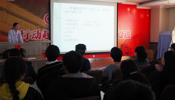 2月20日下午在我院门诊楼4层康乐家园,来自皮肤科激光门诊的宋映雪大夫走进了孕妇课堂,为各位准妈妈带来了关于妊娠纹的相关知识讲座。准妈妈们冒着初春的严寒,早早的来到了康乐家园。我们还为各位参与者精心准备了小礼品和激光知识的相关宣传材料。大家纷纷入座,仔细聆听讲座内容。宋大夫就关于妊娠及产后可能遇到的肌肤问题逐一做了讲解,图文并茂,深入浅出。大家听的聚精会神,津津有味。最后准妈妈们就讲座中及自身遇到的一些问题进行了提问,宋大夫一一耐心解答。为各位准妈妈找出符合自身问题的完美解决方案。