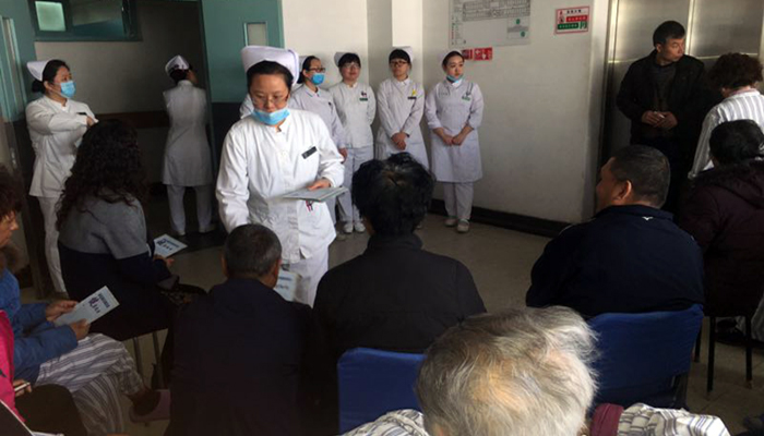 肝病内分泌科党小组在护士长杨玉红组织下,由徐斌主任带队,进病房,在每个糖尿病患者病床前,向患者宣教血糖控制方法、控制情况及其对肝病发展的重要影响,指导患者科学饮食、合理运动的小窍门。主治医师窦爱华向病区患者及其家属集中进行肝病健康宣教,让他们了解脂肪肝—肝炎—肝硬化—肝癌的关系,从而提高对肝病的认知,做到早防早治。
