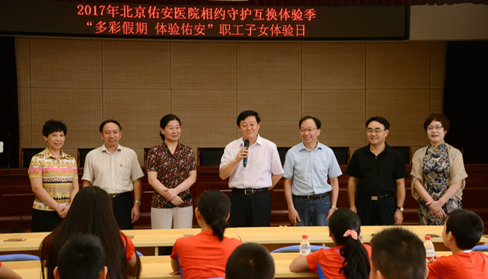 8月17日,为丰富职工子女的暑期生活,了解父母工作环境,体验爸爸妈妈的艰辛付出,北京佑安医院党委组织了主题为“多彩假期体验佑安”相约守护活动,14名佑安医院职工子女来到医院体验父母工作。此次体验活动作为“相约守护”双体验主题活动的一部分,医院领导高度重视,李宁院长、李玉梅书记、向海平副书记、段钟平副院长、金荣华副院长、孙桂珍副院长、刘香玉主席出席了活动。