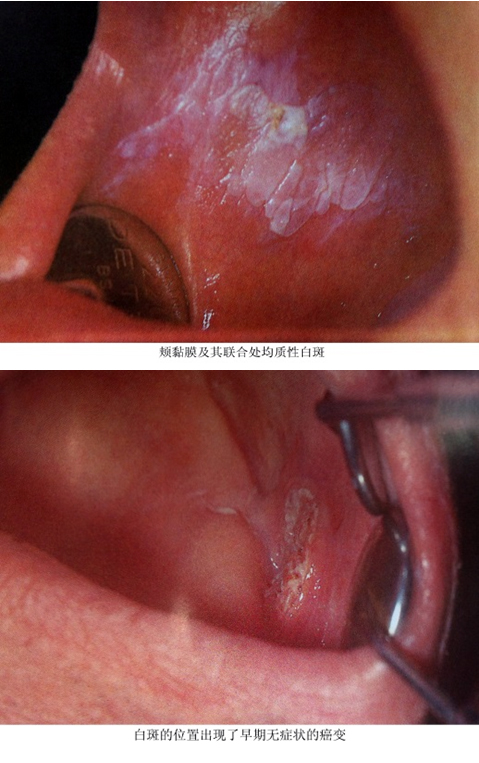 不同类型的口腔白斑病,在口内可有不同的表现——多以口腔黏膜上出现白色或灰白色均质或者不均质的病变为特征,白色损害可为较为均匀的斑块,可为颗粒状突起,也可呈刺状或绒毛状突起。患者可无症状或觉得患病部位粗糙、木涩,较周围黏膜硬。伴有溃疡或癌变时可出现刺激痛或自发痛。