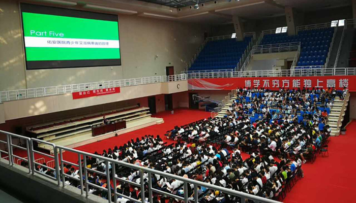 当时钟指向七点三十分时,孩子们陆陆续续走进体育馆。“这是艾滋病防治知识!”、“来,同学,看一看,这是疾病预防知识!”、“这位女同学,给你一本手册!”、“这位男同学,给你一个笔记本,做好记录哦”。临四党支部的党工团员们,满头大汗的发着宣传资料。8点整,临四党支部书记、感染中心门诊主任孙丽君主任医师登上了讲台,为2300名本科学生进行青少年艾滋病现状、挑战及应对策略的宣讲。孙丽君主任从疾病的发展、检测、治疗、预防深入浅出地讲解,赢得了孩子们阵阵掌声。
