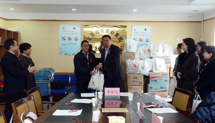 在第30个世界艾滋病日来临之际,2017年11月29日上午,北京红十字会满载着慰问品,来到北京佑安爱心家园,对患者及感染者进行慰问。出席慰问活动的有北京红十字会谢辉副会长,志愿服务部冯克军部长,志愿服务部康革新,邱翔,杨一,赈济部干部毕文硕等,北京市卫计委疾控处徐征,北京市疾控中心艾滋病防治所卢红艳所长,北京性病艾滋病防治协会郑志伟会长,丰台区右安门街道办事处副主任杨文君,右安门街道工委宣统部赵晨雪,北京佑安医院副院长金荣华,佑安爱心家园副秘书长张彤,爱心家园工作人员及志愿者。