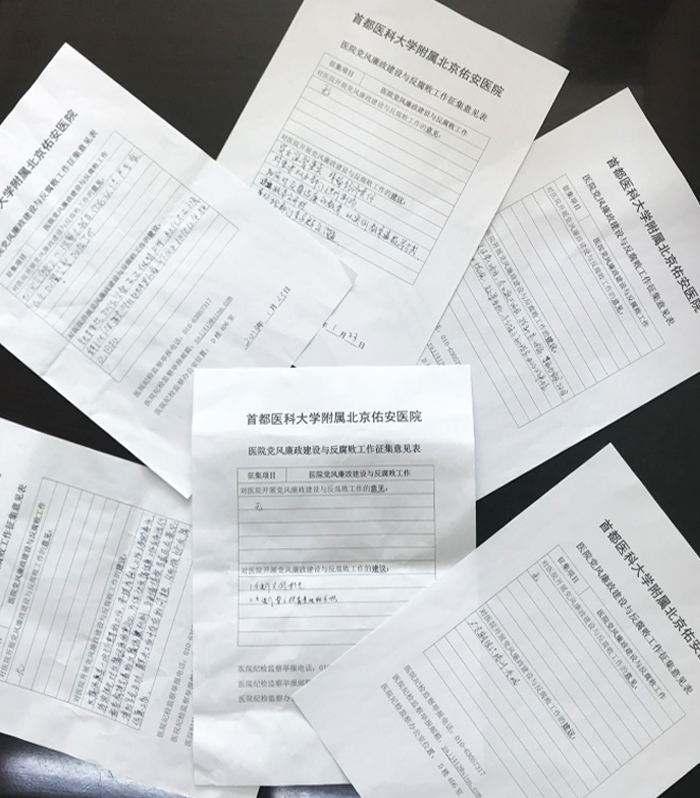 1月23日,纪检监察办公室面向广大职工代表征求关于对医院党风廉政建设与反腐败工作的意见和建议。回收的问卷中,职工代表们表示坚决支持纪检监察工作,同时给予了很多中肯、有效的建议,并迫切希望多组织警示教育参观,加强对职工特别是临床一线广大医护人员的宣传、培训力度。这些可操作性强的意见和建议为今后的纪检监察工作指明了方向。