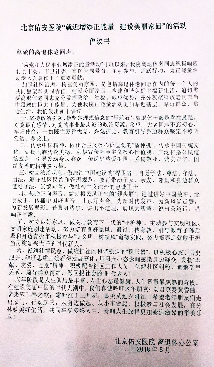 这次活动中,离退办还为大家发放了北京佑安医院“增添正能量 建设美丽家园”活动倡议书,鼓励广大老同志们积极投身所在社区的精神文明创建工作中,投身到为党和人民事业增添正能量活动中来,正如倡议书所言:(1)建设美丽家园,构建和谐美好幸福新生活,迫切需要离退休老同志充分发挥政治、经验、威望优势,充分凝聚释放老同志当中蕴藏的巨大正能量。(2)希望广大老同志不忘初心、牢记使命,教育引导身边群众坚定不移听党话、跟党走。(3)积极宣传社会主义核心价值观,广泛传播公民道德规范,引导发动身边群众,传递好热爱祖国、爱岗敬业、诚实守信、团结友善的精神接力棒。(4)自觉学法、尊法、守法、用法,遵守社区民约和管理规范,教育带动子女、亲友、邻里和身边群众遵纪守法、崇德向善,做社会主义法治的忠诚卫士。(5)通过讲好北京故事、传播北京好声音,为新时代发声,为新风尚点赞,为新发展喝彩。着眼身边事,讲出小道理,展现大智慧,说出公道话,唱响正气歌。(6)积极配合社区工作人员,化解社区纠纷,调解邻里关系,疏导群众情绪,做回报社会的“时代老人”。