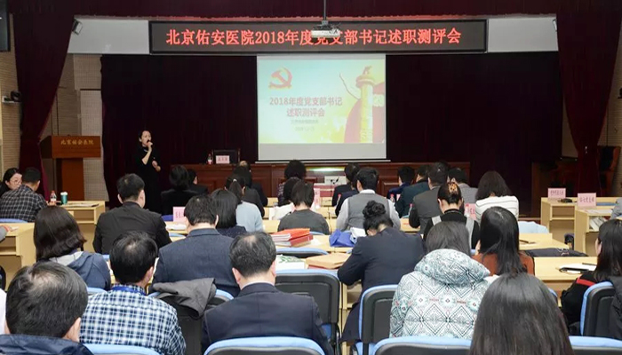 为深入学习贯彻习近平新时代中国特色社会主义思想,落实全面从严治党要求,强化党支部书记作为抓基层党建第一责任人意识,推进党支部规范化建设,12月25日下午北京佑安医院党委召开了2018年度党支部书记述职测评会。党委书记李玉梅、院长金荣华等全体院领导、党委委员、中层干部、各党支部委员、党小组长和部分党代表参加会议,会议由党办主任张晓静主持。