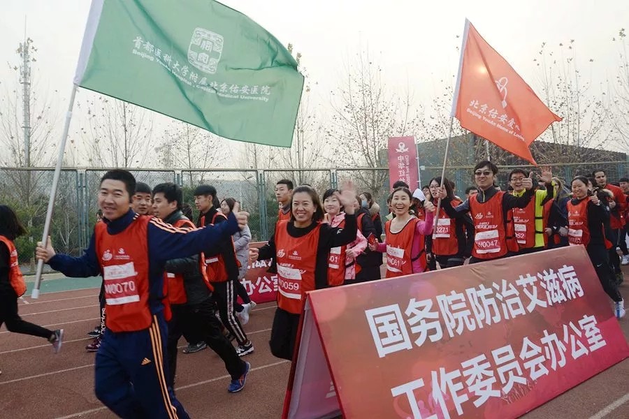 2018年12日1日世界艾滋病日之际,北京佑安医院、北京佑安爱心家园作为支持单位参与了由中华红丝带基金在北京航空航天大学主办的“行动起来向零艾滋迅跑”公益跑活动。北京佑安医院党委书记李玉梅带队,由十名医护人员组成佑安跑团,十名医护人员组成急救专家组、佑安咨询义诊团和啦啦队,不仅为跑者加油助威,还积极宣传艾滋病防治知识。佑安跑团的队员们,不怕寒冷,高举佑安医院和爱心家园的旗帜,在赛道上一展佑安医者的风采。