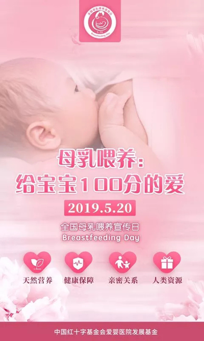 2019年5月20日是第30个全国母乳喂养宣传日,今年的主题是:“母乳喂养,给宝宝100分的爱”。母乳100%天然,可以满足婴儿全部营养需求,是最完美的婴儿食物;母乳中含有多种抗体,保护宝宝免受病毒、细菌伤害,也能够帮助宝宝更快恢复健康,研究发现母乳喂养可以降低女性罹患乳腺癌、卵巢癌、甲状腺癌的发生率;母乳喂养是最自然的养育方式,从分娩后即刻开始的肌肤接触,到宝宝的吸吮,母乳是母婴之间情感交流的纽带;母乳方便经济、是可持续的再生资源。