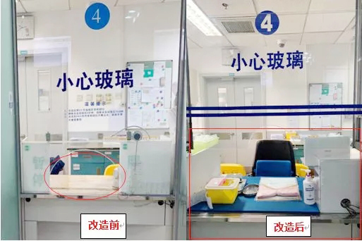 其次,将患者端采血台上的玻璃窗向护士端推进10cm,采血台面积不变,医患采血互动更方便,缩短采血前采血部位确定及消毒准备时间。