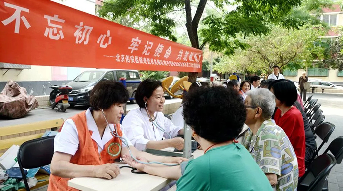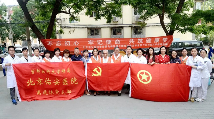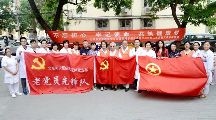 为纪念中国共产党建党98周年,2019年6月25日上午,北京佑安医院以“不忘初心,牢记使命,共筑健康梦”为主题,组织老党员先锋队成员、退休老专家携手团委走进右安门玉林东里二区开展大型义诊咨询活动。