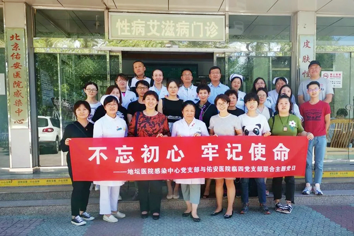 2019年8月27日下午,北京佑安医院临四党支部与北京地坛医院感染中心党支部在佑安医院感染中心门诊举行了“不忘初心,牢记使命”主题党日活动。
