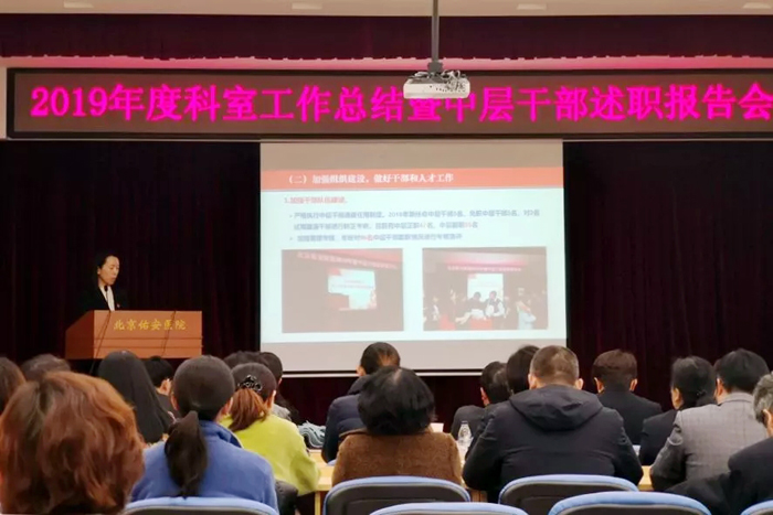 为进一步加强医院对业务科室和职能科室干部的考核与管理工作,客观评价干部的实绩,提高干部的整体素质,促进中层干部履职尽责,北京佑安医院党委于2020年1月2日召开了2019年度科室工作总结暨中层干部述职报告会。出席此次会议的有院领导、党委委员、全体中层干部,会议由党办主任张晓静主持。