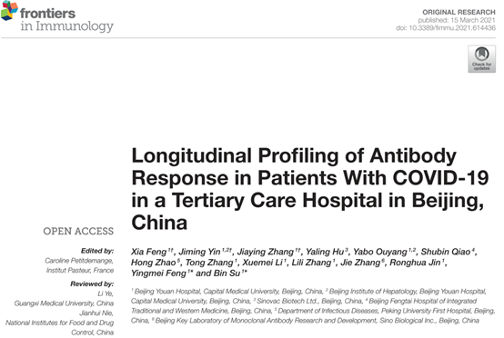 新型冠状病毒(SARS-CoV-2)引起了新型冠状病毒肺炎(COVID-19)的全球大流行,是21世纪以来最严重的公共卫生事件,截止2021年2月底,全球超过1亿人感染该病毒,累计死亡病例超过200万。SARS-CoV-2感染引起的机体免疫应答与病毒的清除、疾病的严重程度和预后,及疫苗的研发等密切相关。SARS-CoV-2表面上的刺突蛋白(S蛋白)和RBD蛋白在介导病毒与宿主细胞融合起到重要作用,它能激活机体产生中和抗体从而阻断病毒的入侵。然而,不同临床分型的康复期患者中和抗体滴度的动态变化特征尚未完全阐明。因此,研究SARS-CoV-2感染后特异性抗体产生的持久性具有非常重要的意义。近期,首都医科大学附属北京佑安医院的医护人员在国际免疫学前沿期刊《Frontiers in Immunology》在线发表了题为 " Longitudinal Profiling of Antibody Response in Patients with COVID-19 in a Tertiary Care Hospital in Beijing, China "的研究论著。