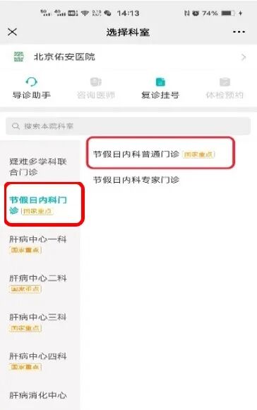2.节假日:进入“节假日内科门诊”后,包含“节假日内科普通门诊”与“节假日内科专家门诊”,选择第一个亚科即可。