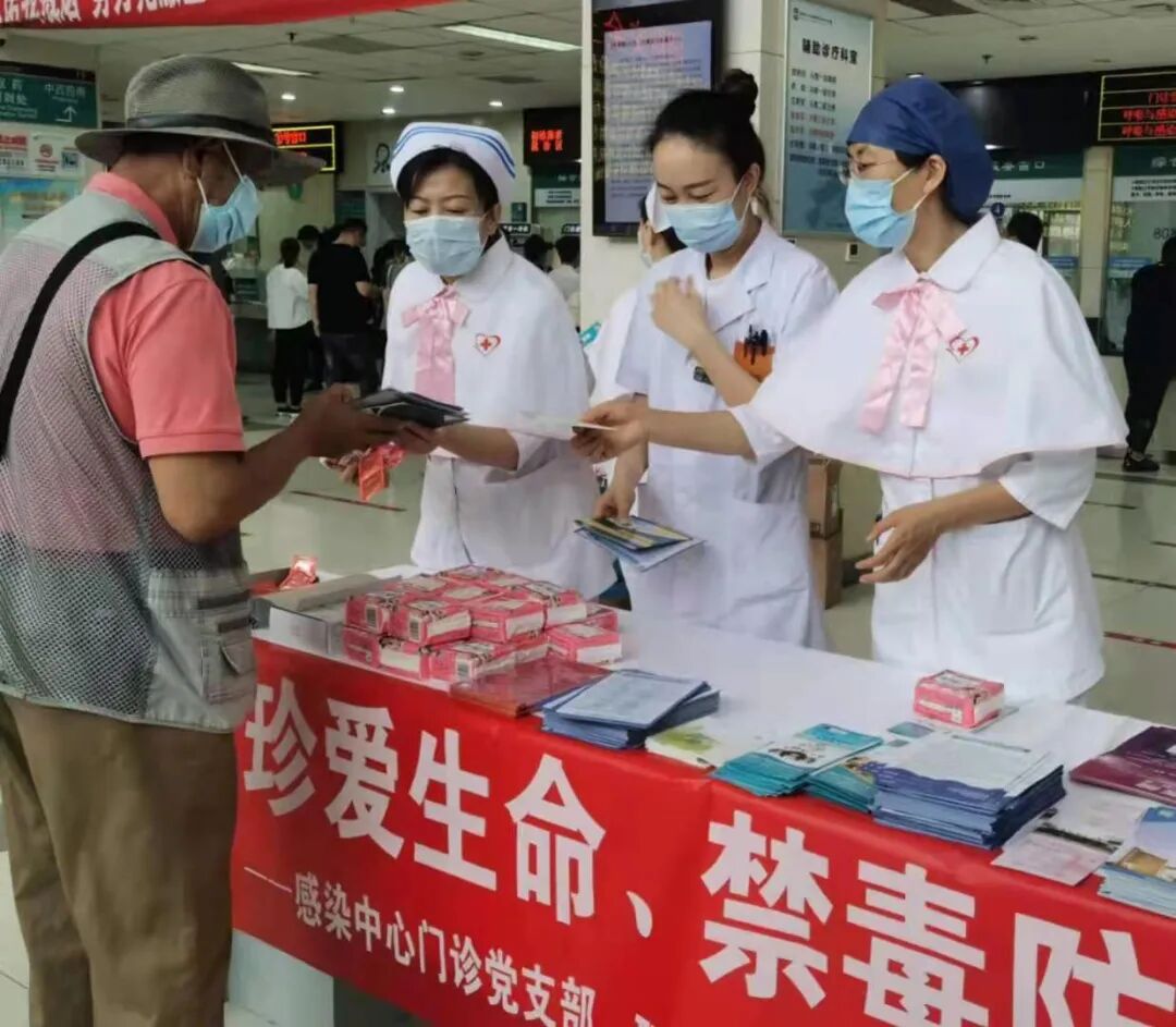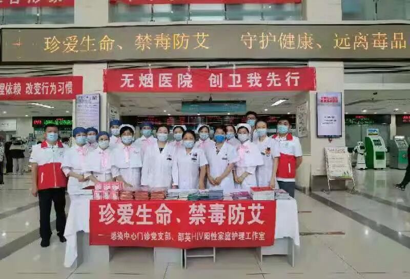 在6月26日世界禁毒日来临之际,感染中心门诊党支部、HIV阳性家庭护理工作室在25日上午于佑安医院A楼一层大厅联合举办 “禁毒防艾”知识宣传活动。参与本次活动的还有感控处、南丁格尔志愿服务队、爱心家园恬园工作室。