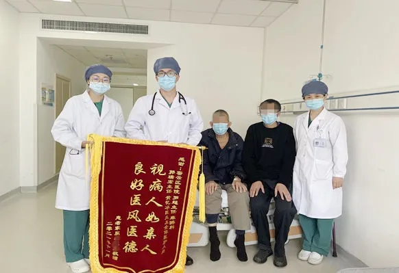 患者二次手术后,起初恢复顺利,家属及患者期盼早点儿出院。然而,事与愿违,术后第三天患者突然发热38℃,伴上腹胀痛、恶心等不适;胆红素、转氨酶及肌酐升高;MRI:不除外十二指肠乳头占位。患者及家属面对新的打击,信心严重受挫,情绪波动很大,一度有放弃治疗的打算。罗超医生与刁英智副院长、泌尿科医生及时就患者病情研究对策,并组织北大医院及北京佑安医院普外、消化及介入科专家进行远程咨询、会诊。综合各会诊意见初步排除恶性占位可能,给予积极的抗感染及胃肠外营养等内科保守治疗。罗超医生在工作之余每天跟进患者病情发展,多次在休息时间看望患者及家属,并与家属充分沟通给,予家属信心和希望。最终患者于2021年11月17日康复出院。出院当天患者和家属送上锦旗以示对罗超医生及所有医务人员的感谢。