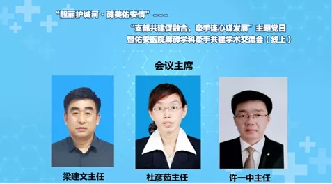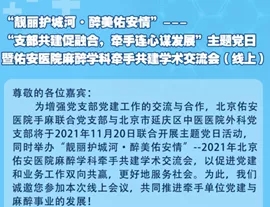 由首都医科大学附属北京佑安医院手麻联合党支部主办,北京中医医院延庆医院、延庆区中医医院外科党支部、河北省石家庄市藁城人民医院和河北省邢台市第二医院协办的“支部共建促融合,牵手连心谋发展”主题党日暨佑安医院麻醉学科牵手共建学术交流会于2021年11月20日在线上成功举办。