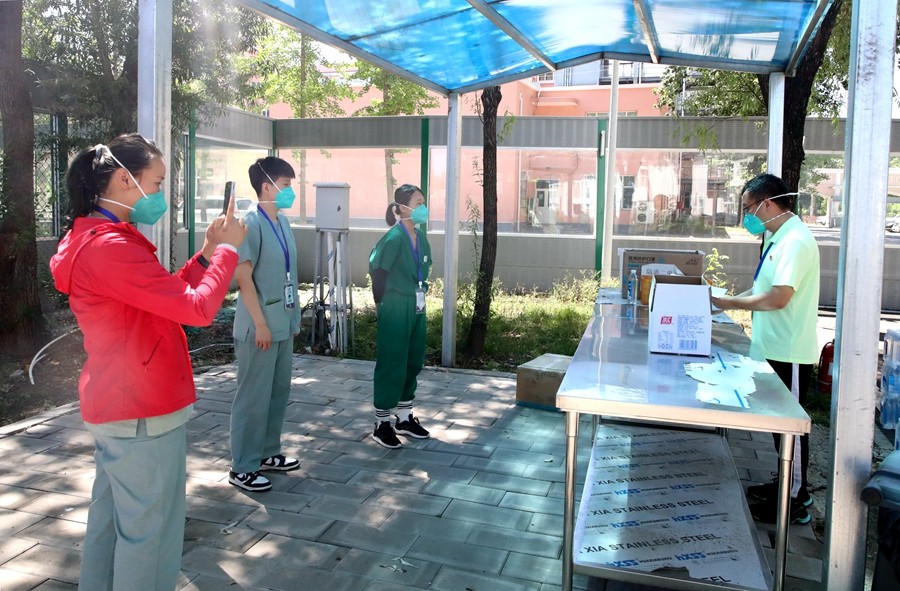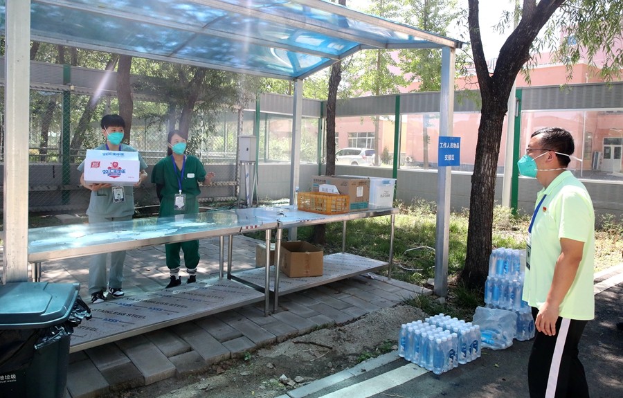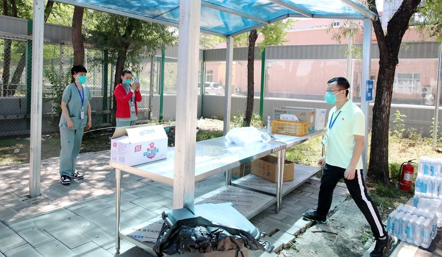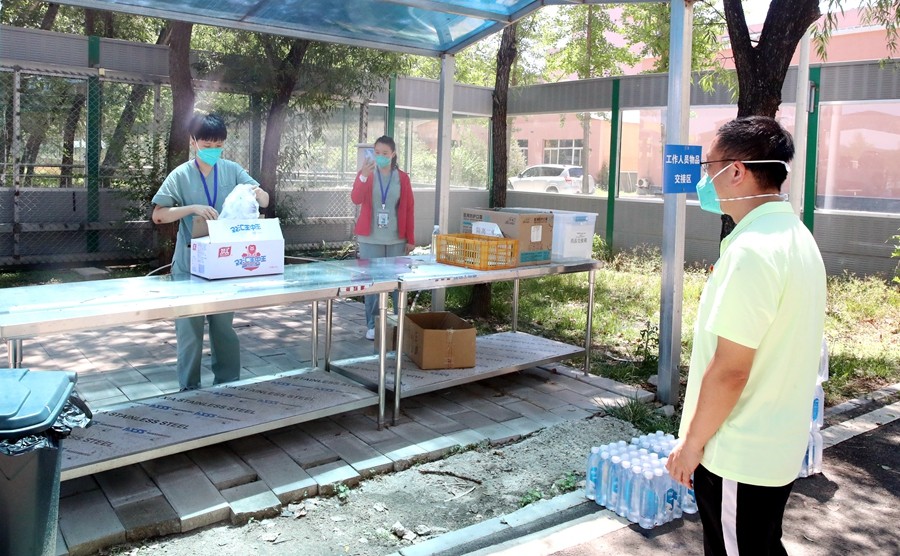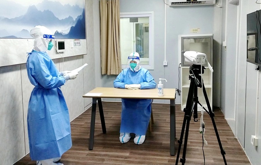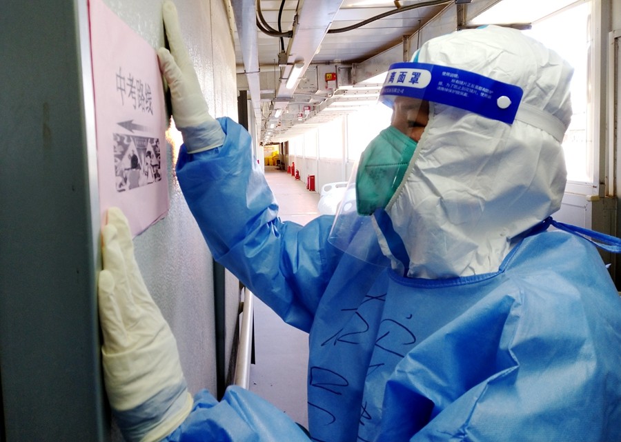 2022年6月23日北京市初中学业水平考试前夕,小汤山方舱医院里展开了一场全流程、全要素的中考考场设置演练工作。
