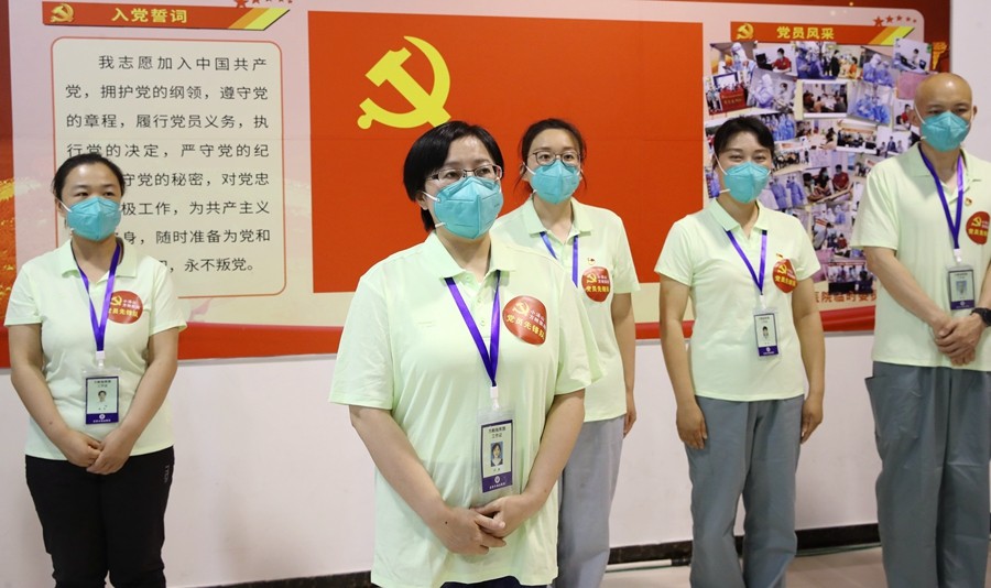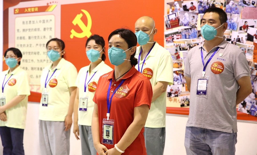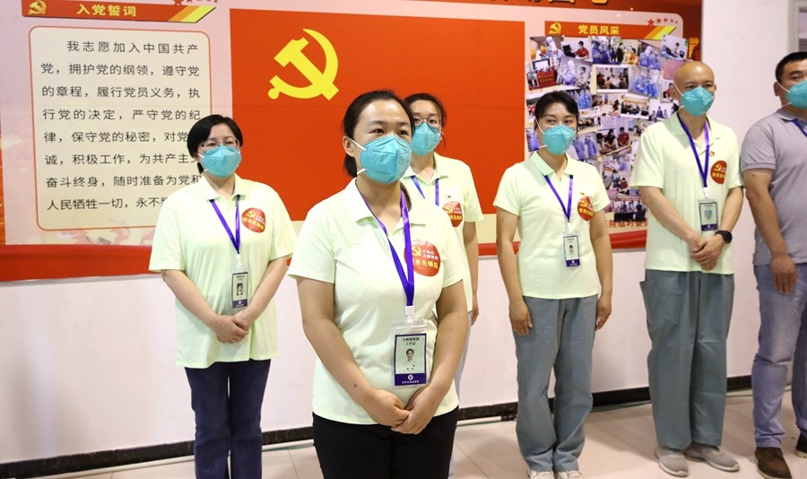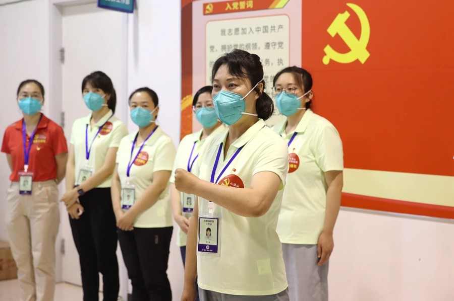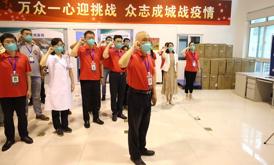 坚持思想引领,先行设立5个临时党支部,规范支部建设,梳理管理框架,制定工作制度,成立党群工作部、综合护理部、医疗感控部和药械部。同时将建工集团负责的后勤保障部,纳入临时管理框架,加强沟通,密切合作。在党员中开展“亮身份、做表率”党员先锋队品牌项目创建活动,激励和引导党员医务工作者在创建活动中践行初心使命,在大战大考中见精神、见能力、见作风、见成效,真正当先锋、作表率。截止目前,各临时党支部收到入党申请书30余份,思想汇报40余份,广大医护人员用行动诠释铮铮誓言。