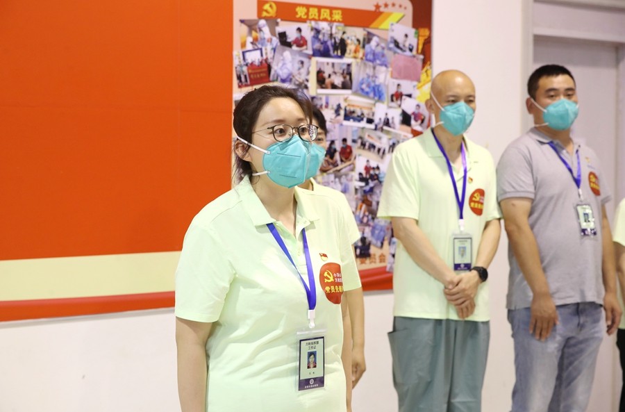 党旗在方舱医院高高飘扬。