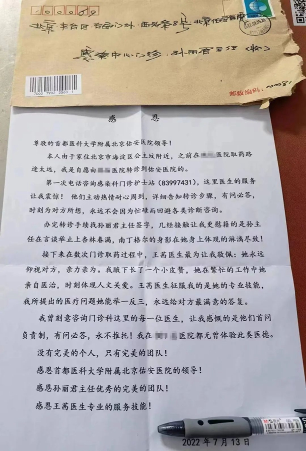 近日,北京佑安医院感染中心门诊孙丽君主任收到一封患者来信,患者在信中用最真挚的语言表达对佑安医院感染中心门诊团队的感谢。