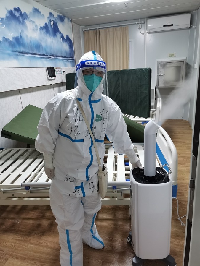来自肝病中心三科的护士长韩会山,进舱前反复熟悉隔离单元突发事件应急预案、舱内隔离区医用垃圾处理流程、护目镜清洗消毒流程等,作为感控护士她主动进入舱内隔离区熟悉各项操作,与同批次进舱的感控护士分享经验,为每一位进入隔离区的工作人员保驾护航。终末消杀她担任小组长,在完成了5号楼的消杀任务后,她又进入3号楼协助总护士长制定消杀计划、实施消杀方案,她一次次进入隔离区,勇担重任。