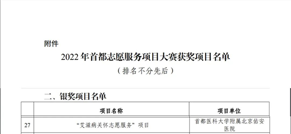 经过申报、初赛、复赛等一系列激烈角逐,“以爱助艾”艾滋病患者关怀项目从1443个项目中进入决赛,在决赛路演中,“以爱助艾”艾滋病患者关怀项目受到评委们一致认可,获得2022年首都志愿服务项目大赛银奖。
