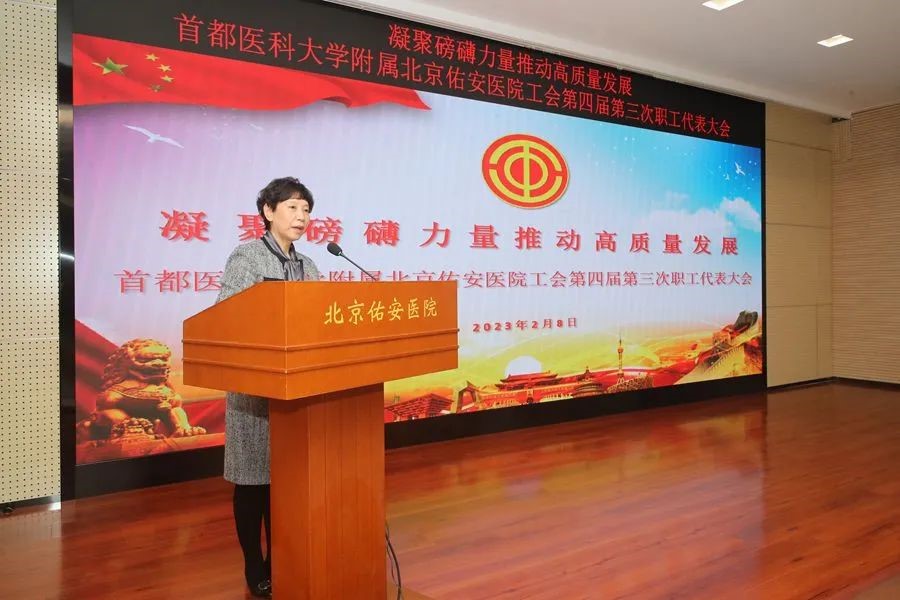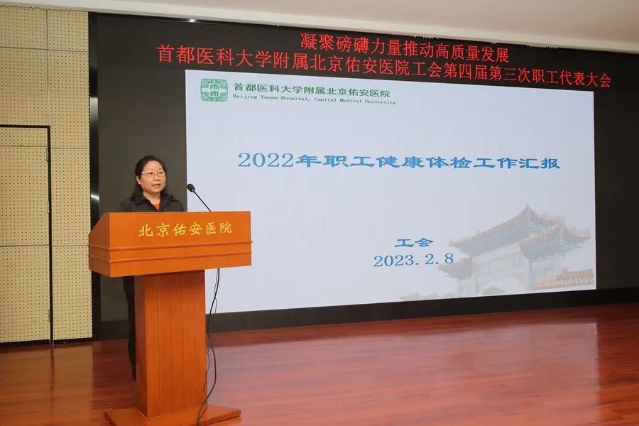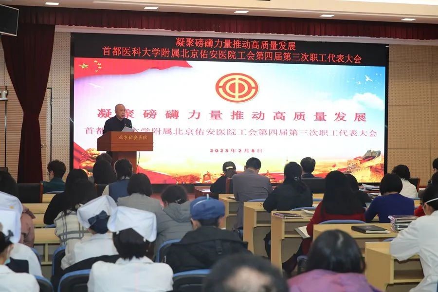 2023年2月8日下午,首都医科大学附属北京佑安医院工会在医院党委的关心指导下,召开了“凝聚磅礴力量,推动高质量发展”为主题的第四届第三次职工代表大会。本次大会应到职工代表89人,实到75人,参会人数符合规定,本次会议由工会主席刘香玉同志主持。