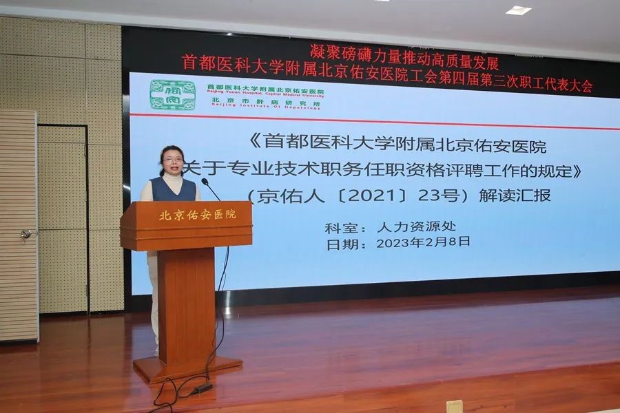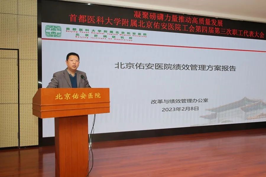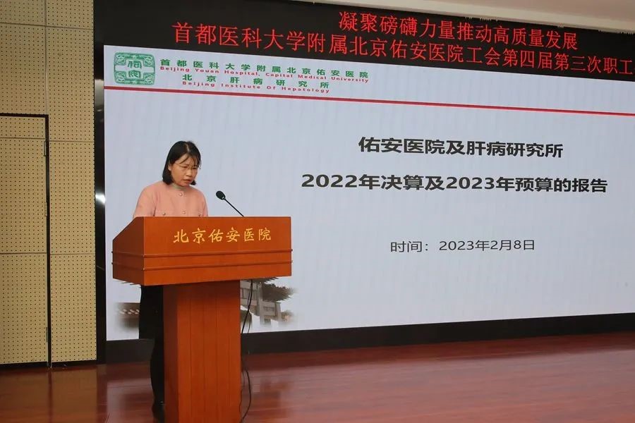 大会在嘹亮的国歌声中拉开帷幕。会上,职工代表认真审议了院长马迎民同志关于《医院2022年工作报告及2023年工作计划》,张春妮总会计师关于《佑安医院及肝病研究所2022年决算及2023年预算的报告》,各位代表仔细倾听,并认真行使手中的权利,与会代表一致通过审议事项。改革与绩效管理办公室张强主任讲解了《北京佑安医院绩效管理方案》;人力资源处葛晓娟同志解读了《首都医科大学附属北京佑安医院关于专业技术职务任职资格评聘工作的规定》(京佑人〔2021〕23号);工会副主席仇淑华作了题为《2022年度首都医科大学附属北京佑安医院职工体检情况》的汇报。职工代表以团结、民主、务实、创新的主人翁精神,充分行使了民主决策、民主管理和民主监督的权力,达到了预期目的。